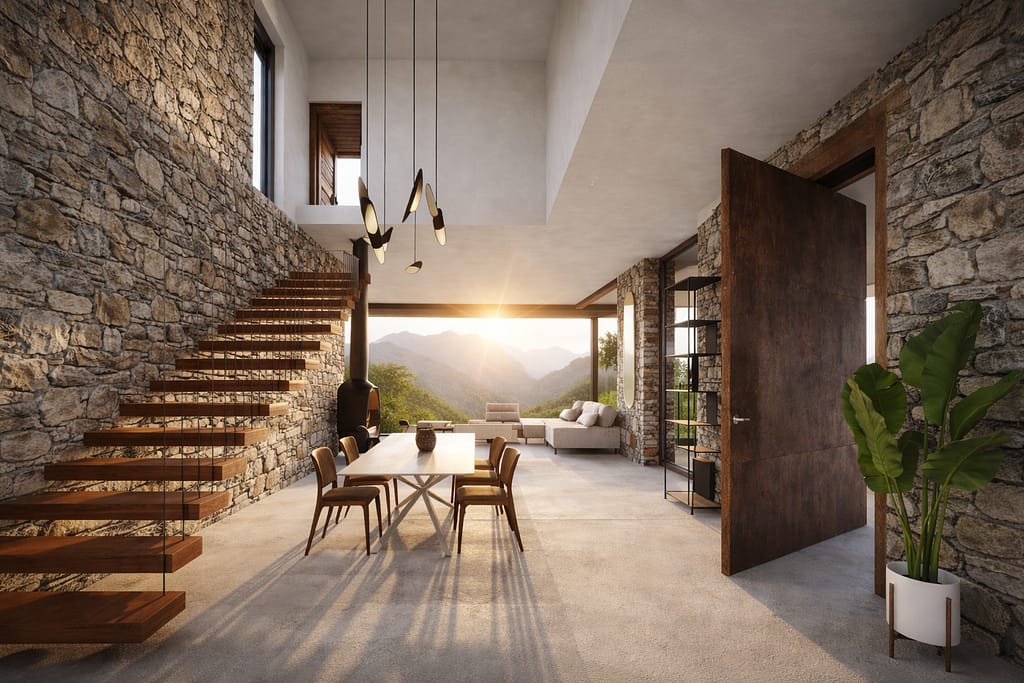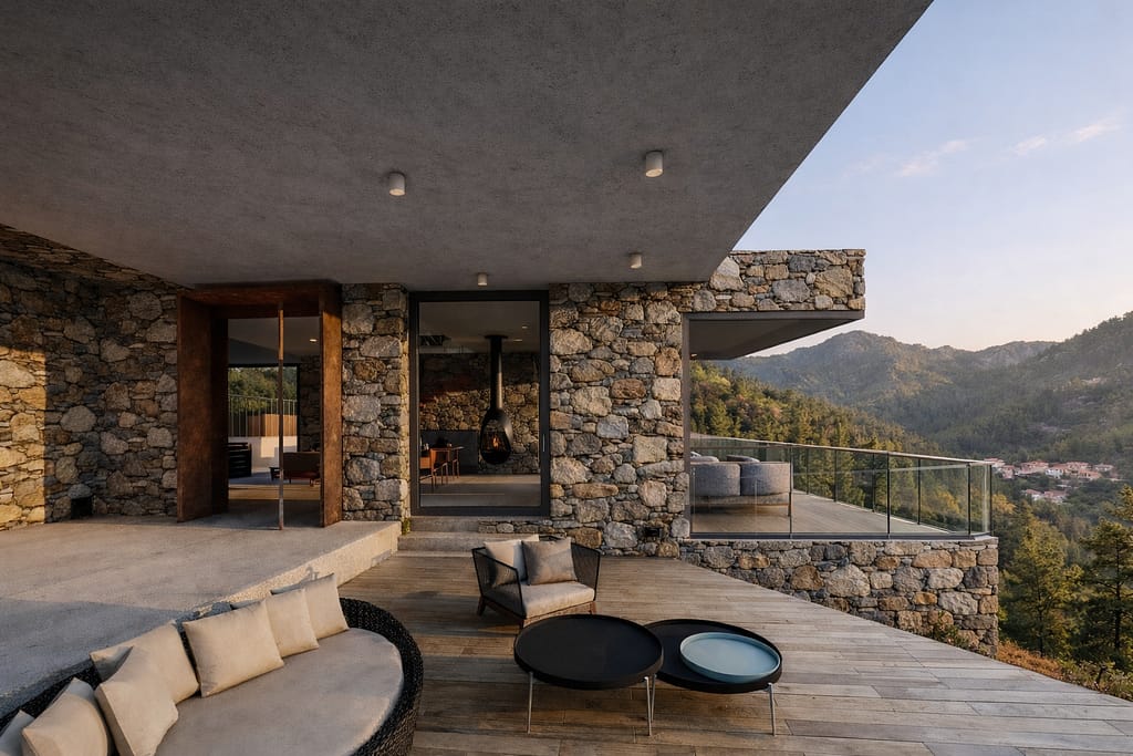 The panoramic view is the main feature of the interior living rooms and master bedroom. On the floor, ceramic with a concrete surface unifies all the rooms and recalls the foundation's natural appearance. While complementing the surroundings, the concept prioritizes the living space as a modern area that invites calm.