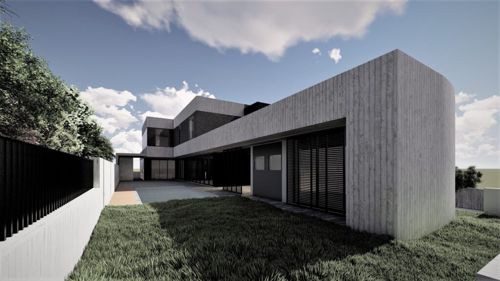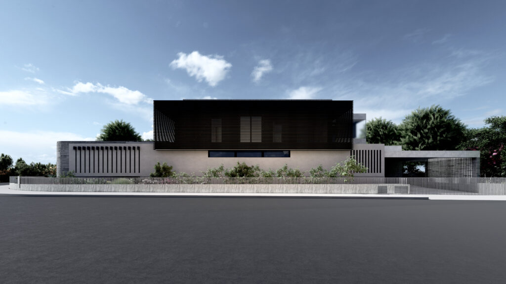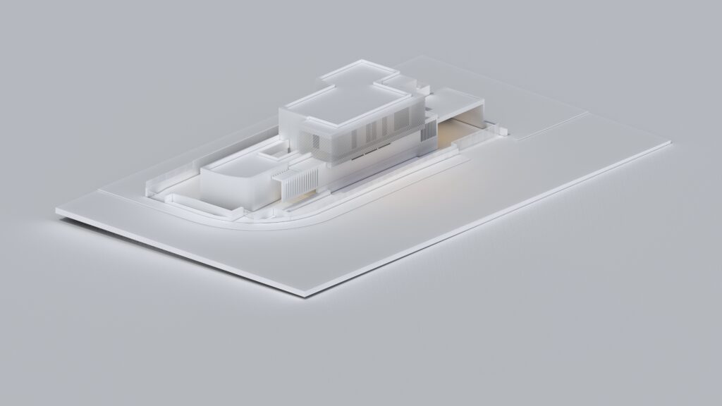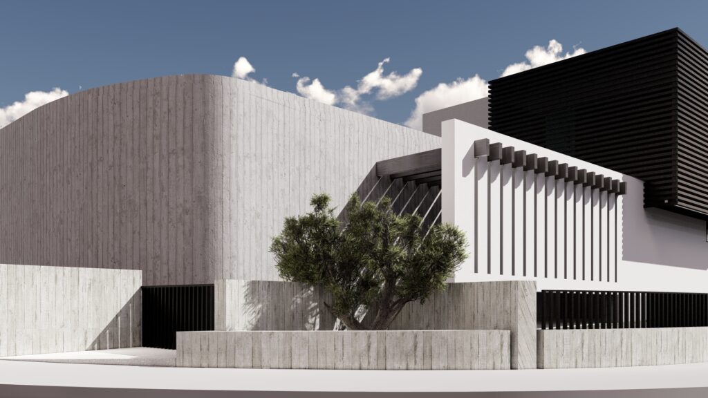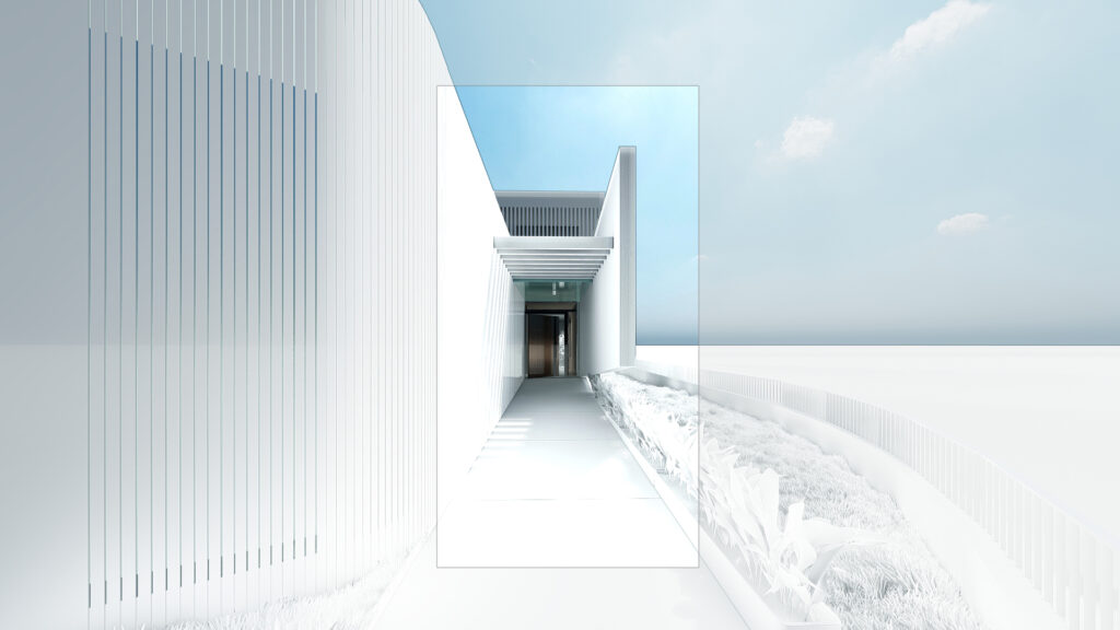 A broad walkway extends from the street to the entrance of the building. Board-formed concrete, clear-grade wood, poured terrazzo flooring, and wide minimal windows make up the high-quality material palette of the two structures.