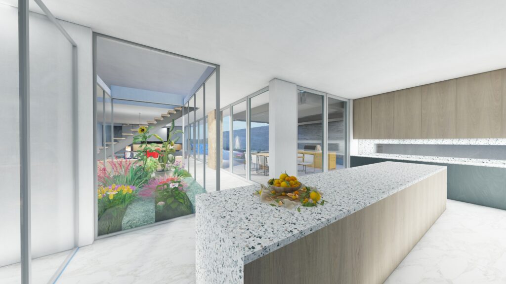 The resulting arrangement of buildings replaces the traditional "backyard" with a shared "middle-garden," directing views, movement, and activity to the property's peaceful centre. The resulting design streamlines the pool into a rectangular body of water, complementing the dramatic horizontality and spaciousness of the original residence. The pathway then ascends to the second floor through a skylighted staircase made entirely of milled wood, resulting in the master bedroom with views back over the courtyard.