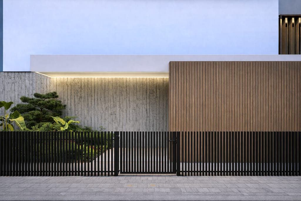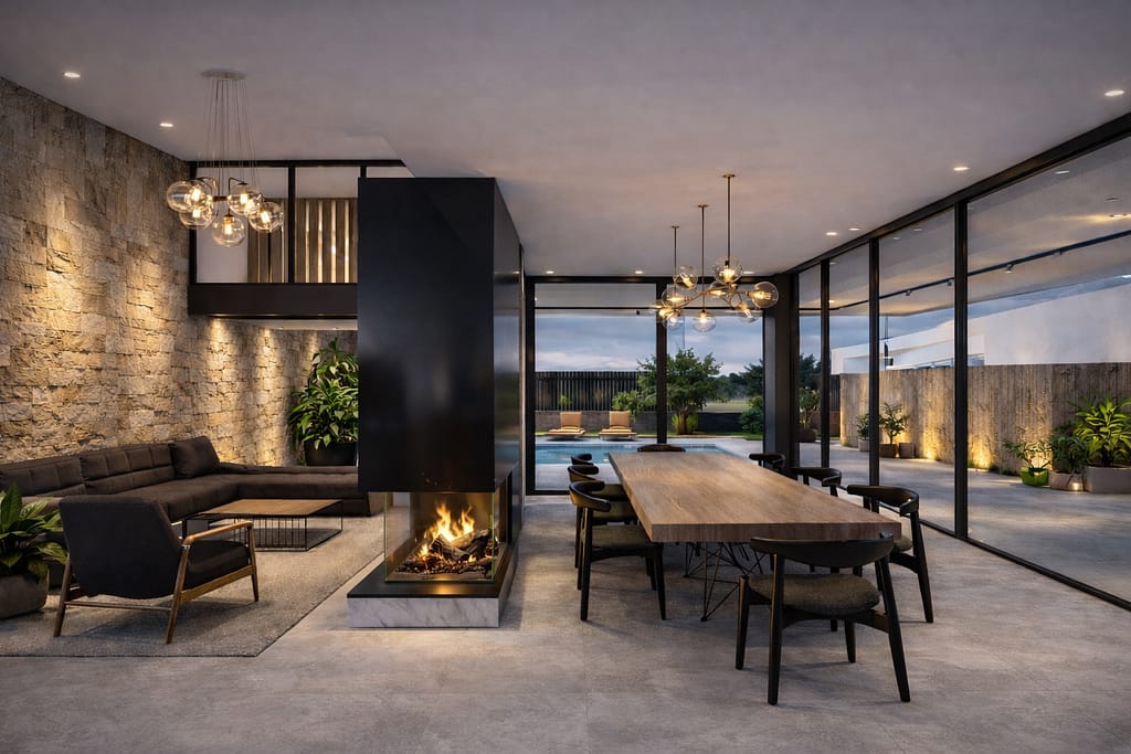 A sculptural fireplace anchors this open-plan living space, separating lounge and dining while preserving visual flow. Textured stone, matte grey floors, and black metal volumes create a refined, contemporary palette, softened by warm lighting and natural greenery. Floor-to-ceiling glazing extends the interior toward the pool terrace, blurring boundaries and elevating everyday living into a seamless indoor–outdoor experience.
